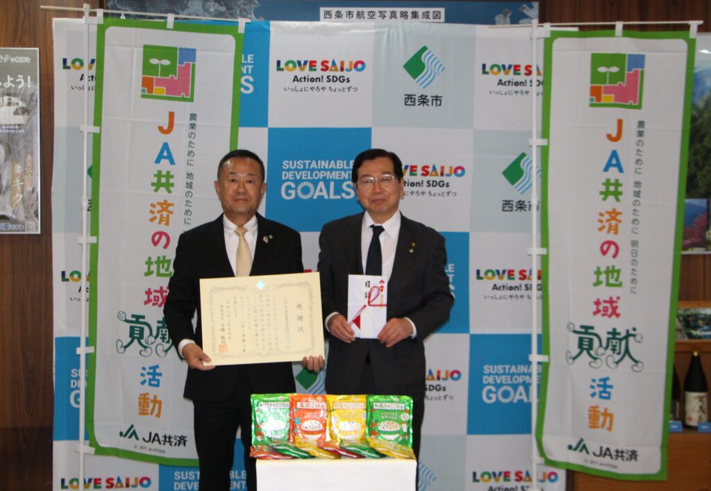 JAえひめ未来は、組合員・地域の皆様のために地域貢献や災害支援を目的として、西条市へJA全農の長期保存食(防災食)1,200食を寄贈しました。