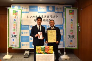 JAえひめ未来は、組合員・地域の皆様のために地域貢献や災害支援を目的として、先日の西条市への寄贈に引き続き、新居浜市へJA全農の長期保存食(防災食)1,200食を寄贈しました。